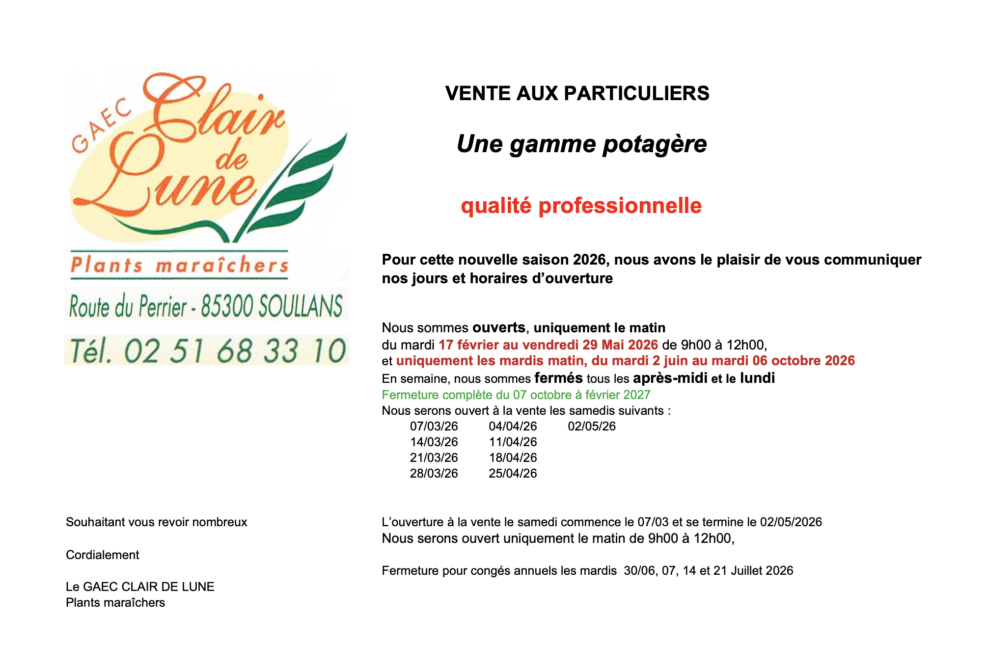 Bienvenue sur le site du Gaec Clair de lune, producteur de plants maraîchers basé en Vendée à Soullans.