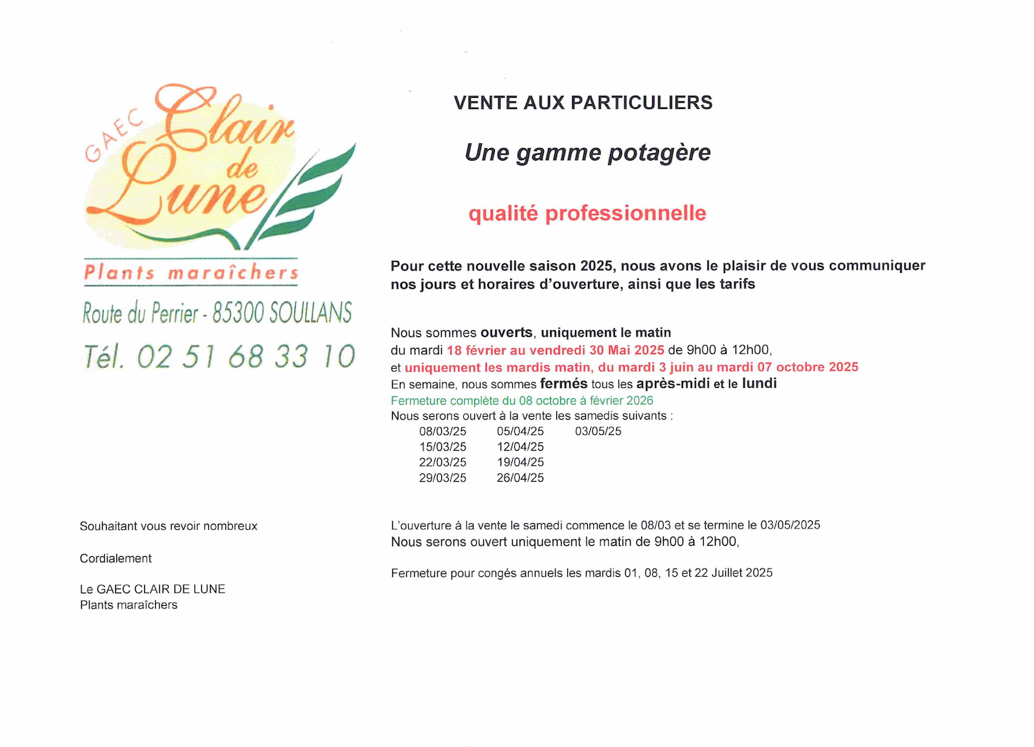 Bienvenue sur le site du Gaec Clair de lune, producteur de plants maraîchers basé en Vendée à Soullans.